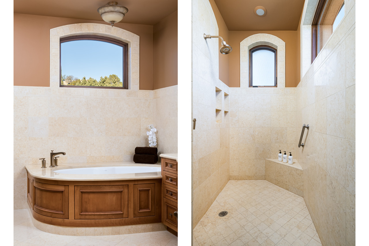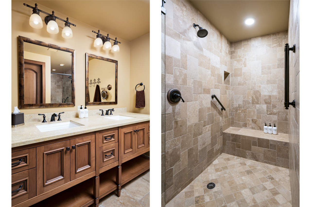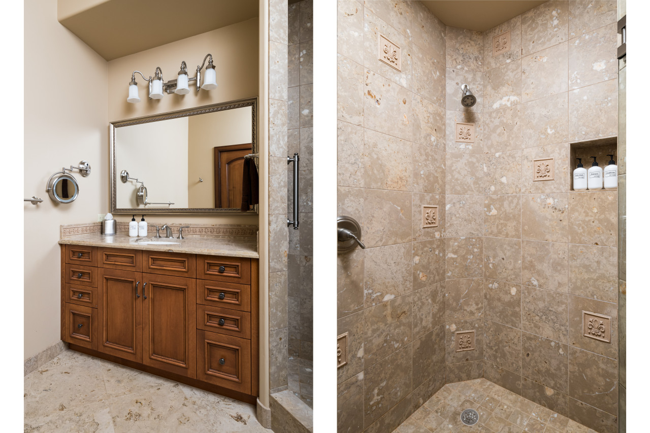 bathrooms, both of which have tile/glass showers. You can also access the patio and pool/spa