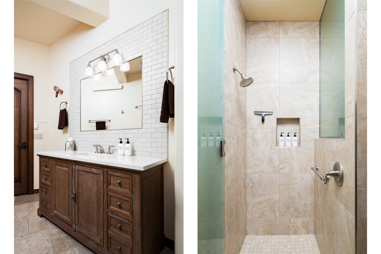 counter vanity and tile/glass shower.