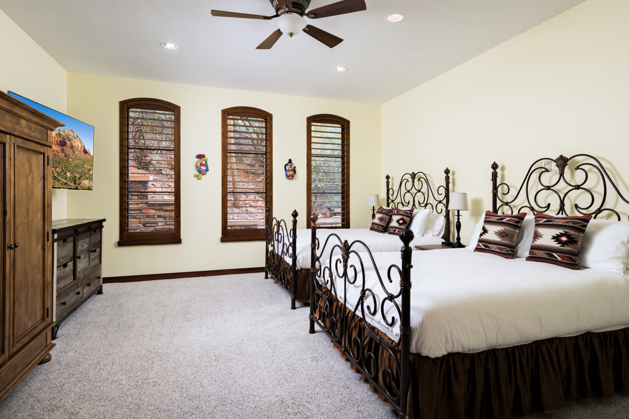 Bedroom 3 (lower level) -- Two queen beds, 65” Smart TV, and access to two shared full