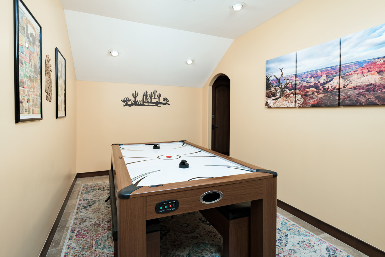 room with an air hockey table and an electronic dartboard.
