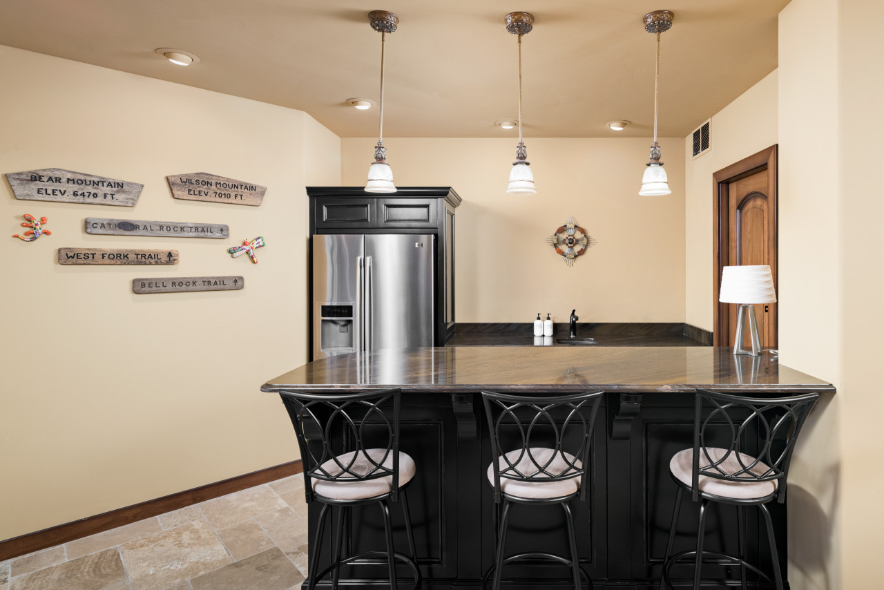 full-size refrigerator, mini-dishwasher and bar seating for three. There’s also a separate game