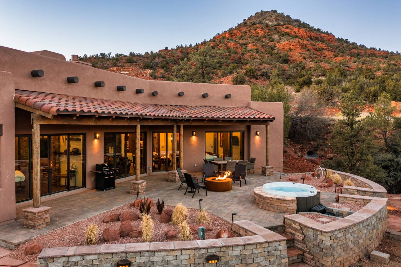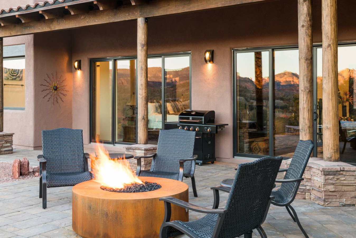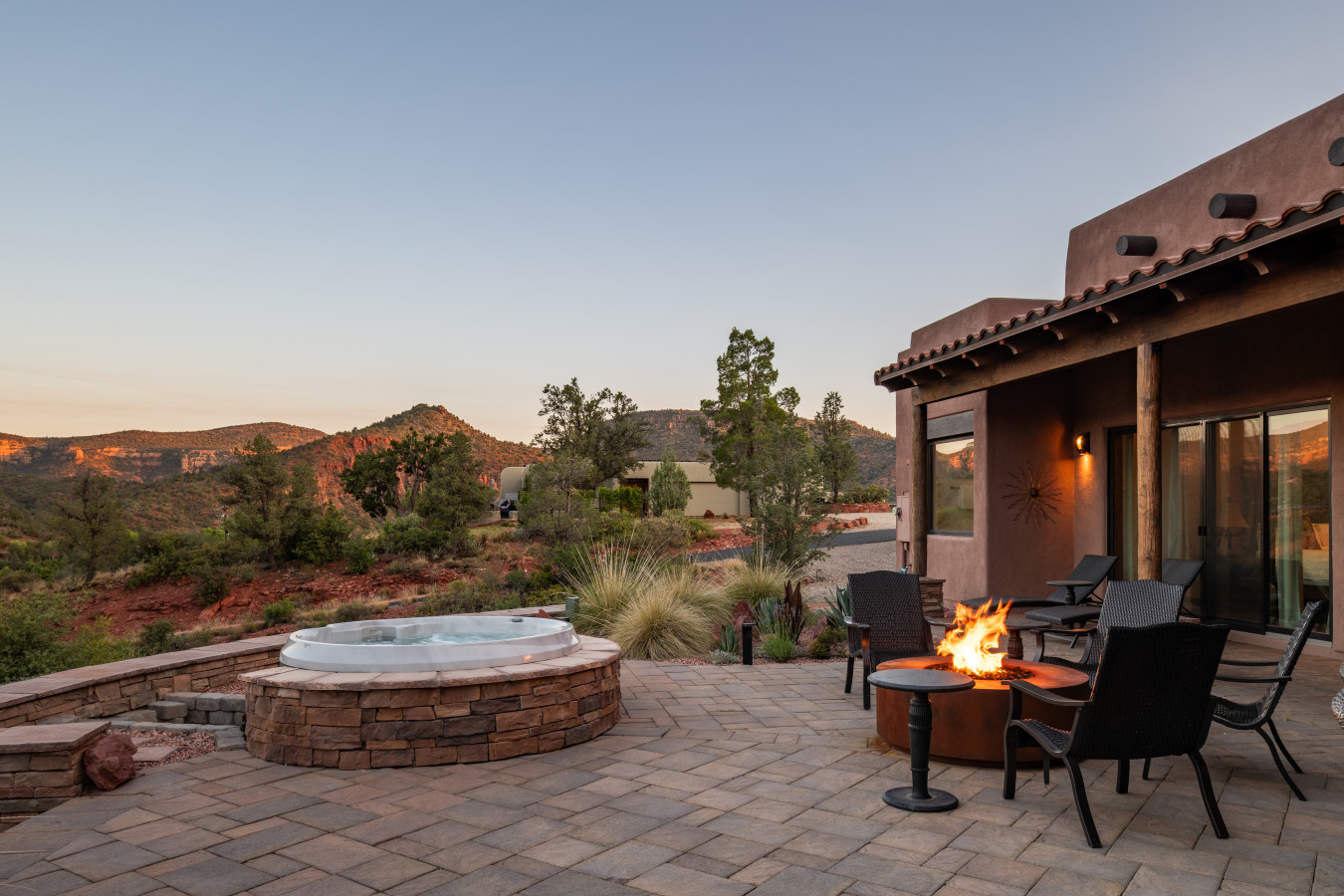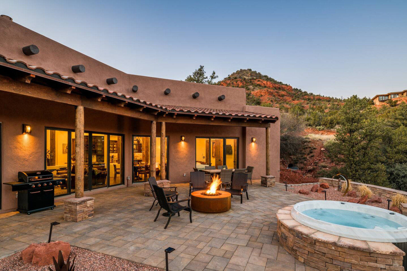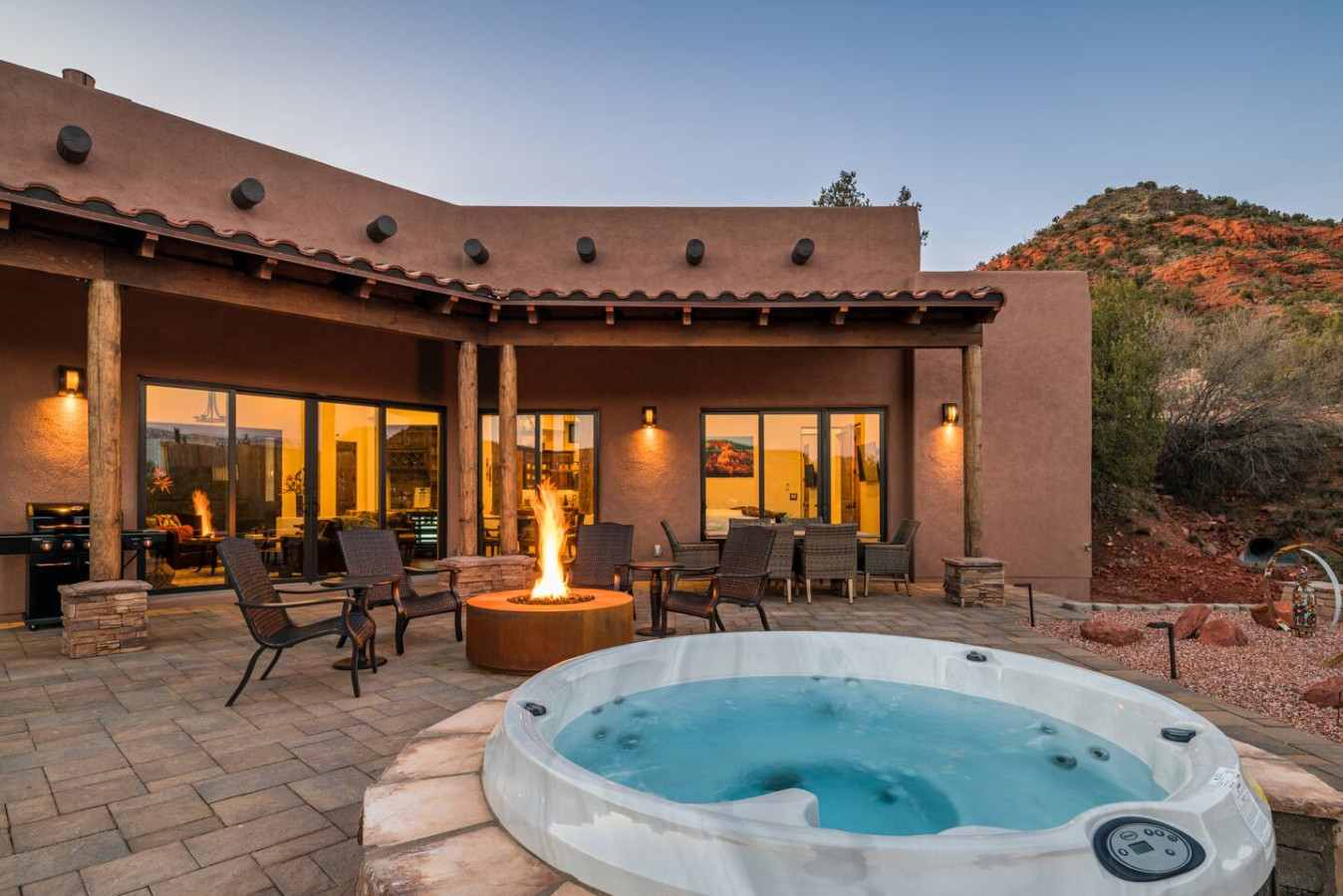 Slip into the hot tub as the sun dips behind the red cliffs, the water mirroring the colors of the sky. Light a fire in the stone-ringed fire pit and watch the stars begin their quiet dance. Share stories and a glass of wine on the covered patio, where a large dining table welcomes everything from laid-back breakfasts to candlelit dinners.