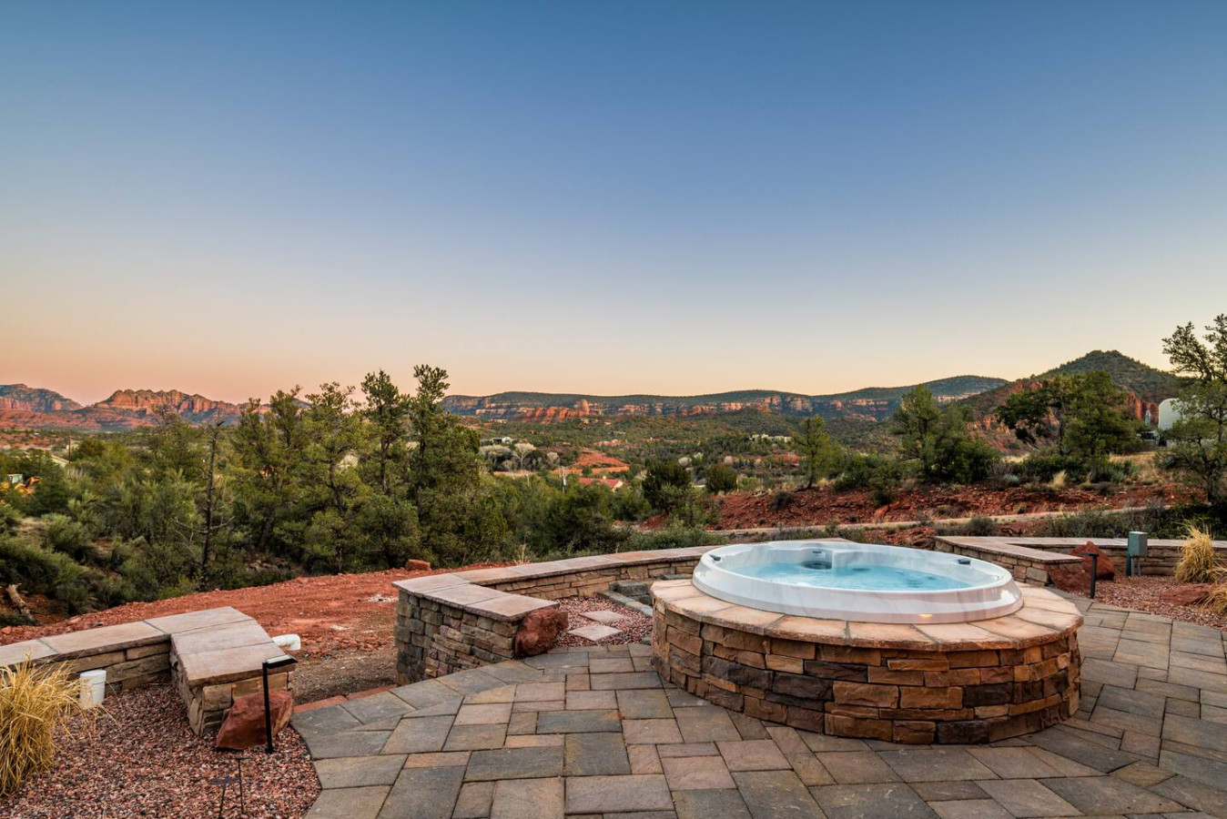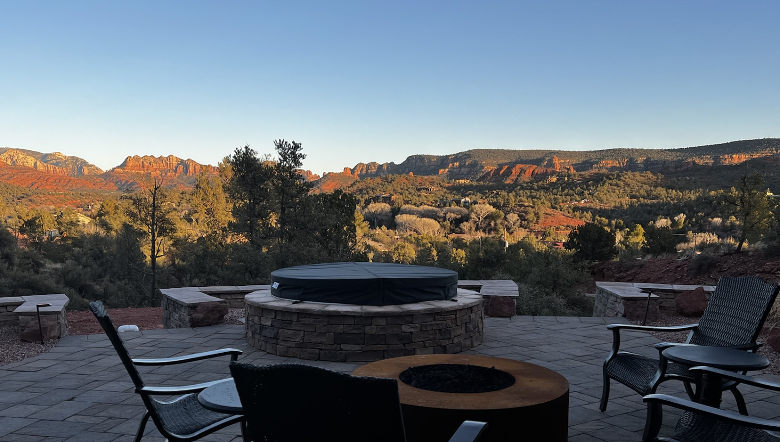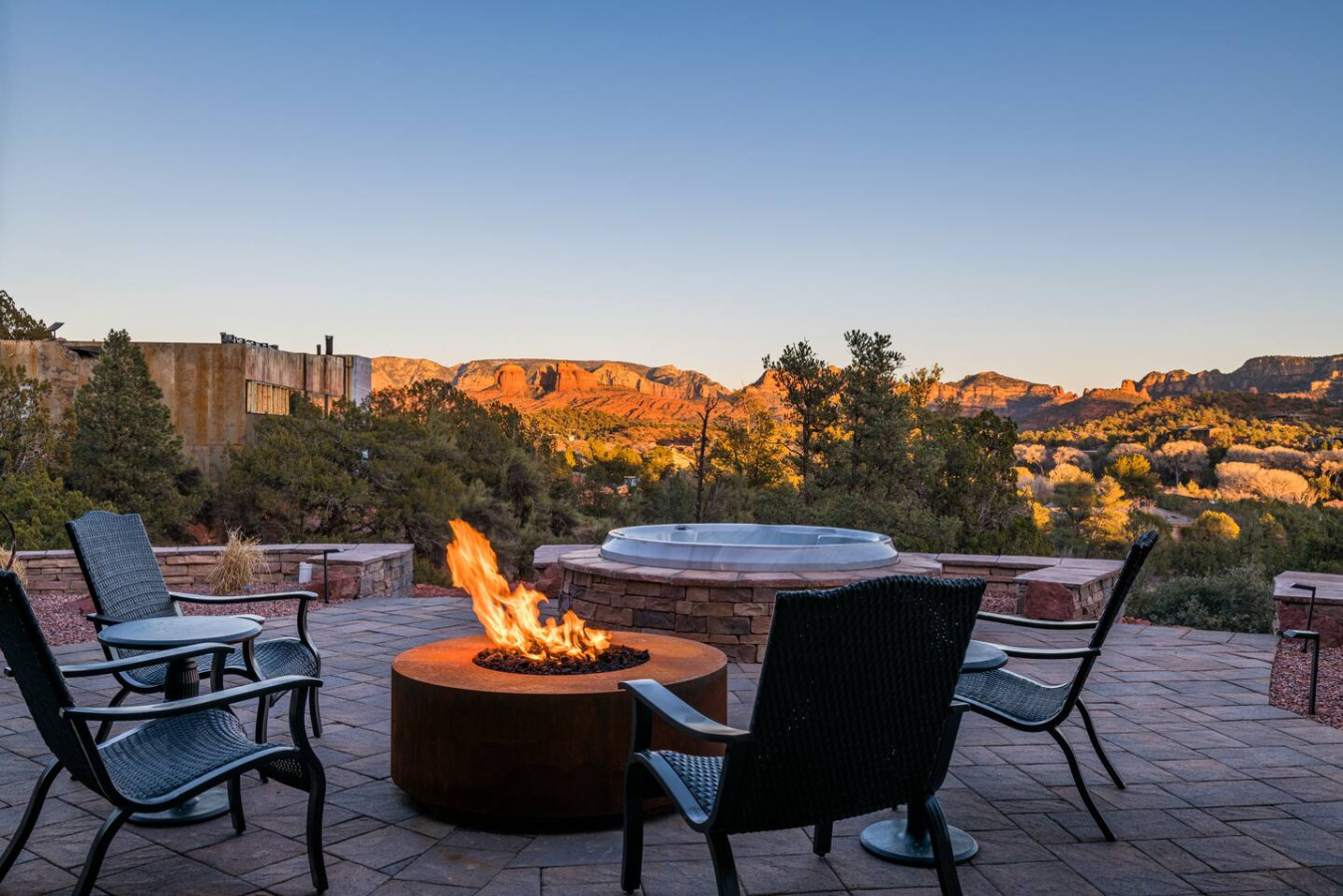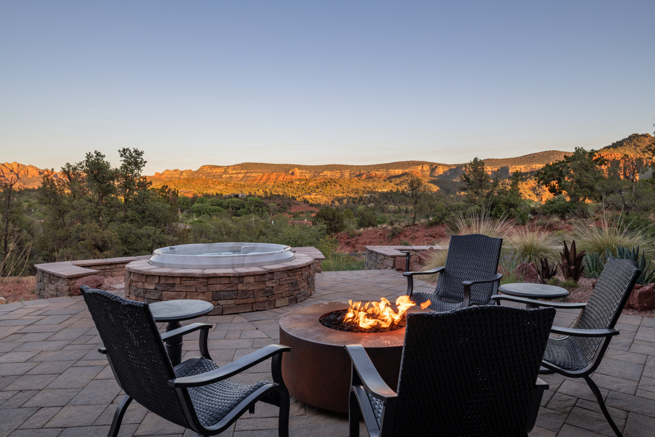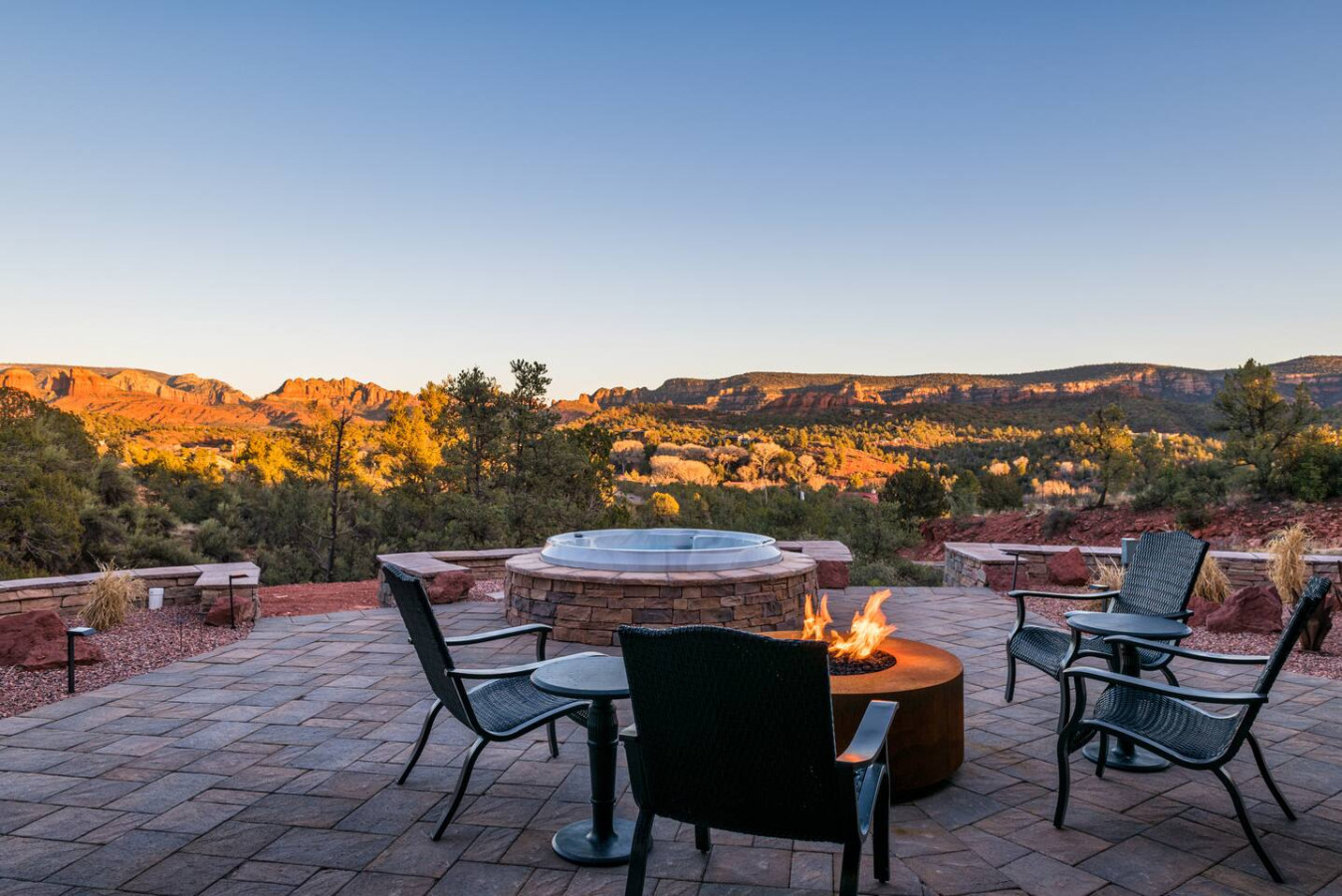Slip into the hot tub as the sun dips behind the red cliffs, the water mirroring the colors of the sky. Light a fire in the stone-ringed fire pit and watch the stars begin their quiet dance. Share stories and a glass of wine on the covered patio, where a large dining table welcomes everything from laid-back breakfasts to candlelit dinners.