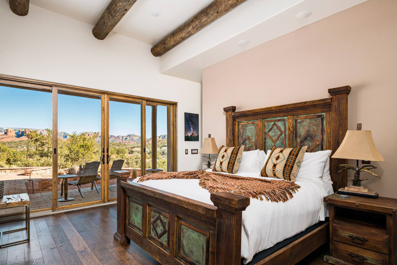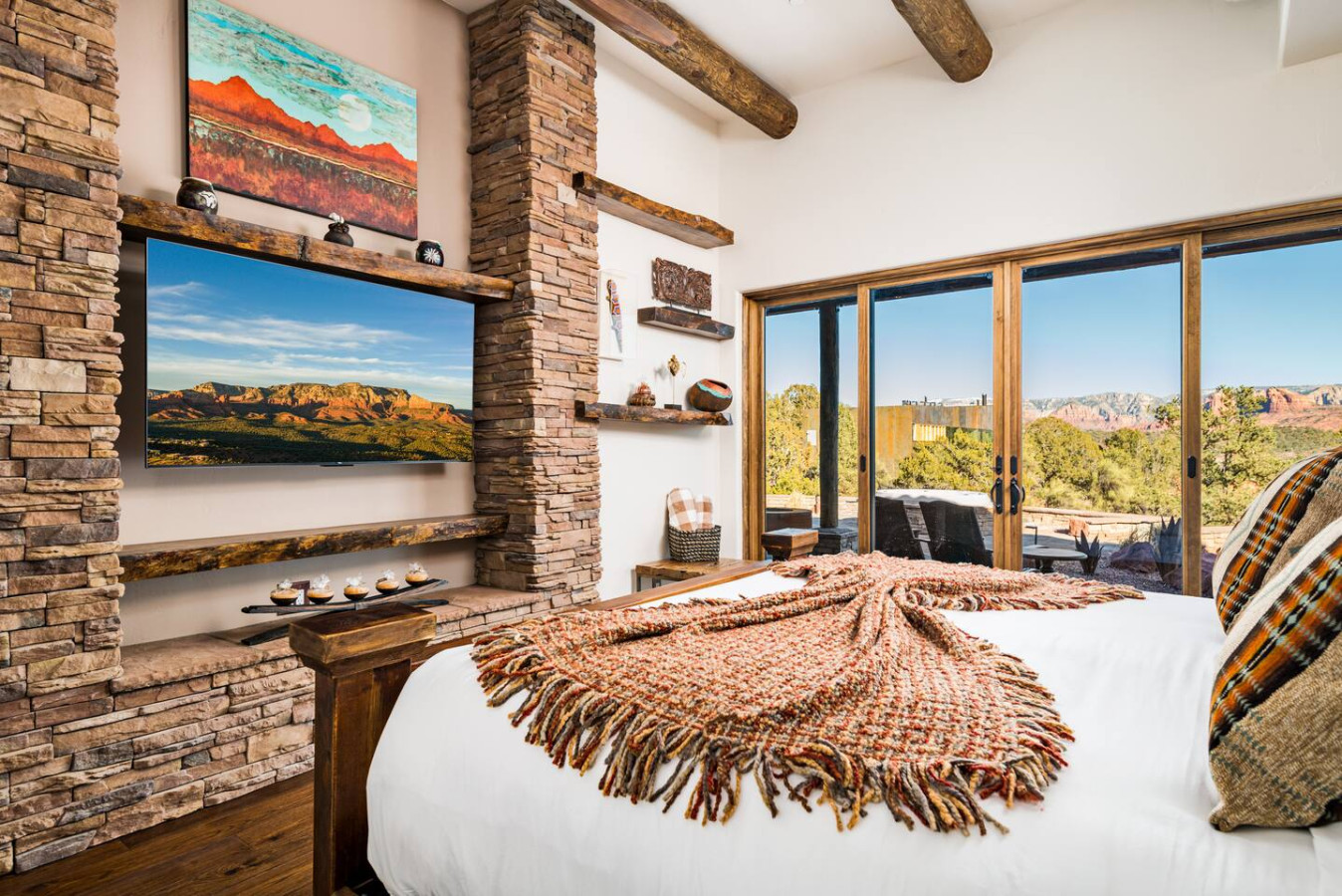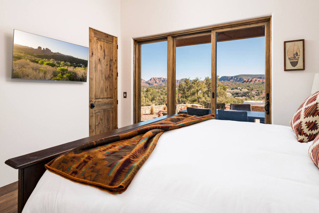 *Bedroom 1 (Primary) – King bed, ensuite bath, patio access, TV, stunning views