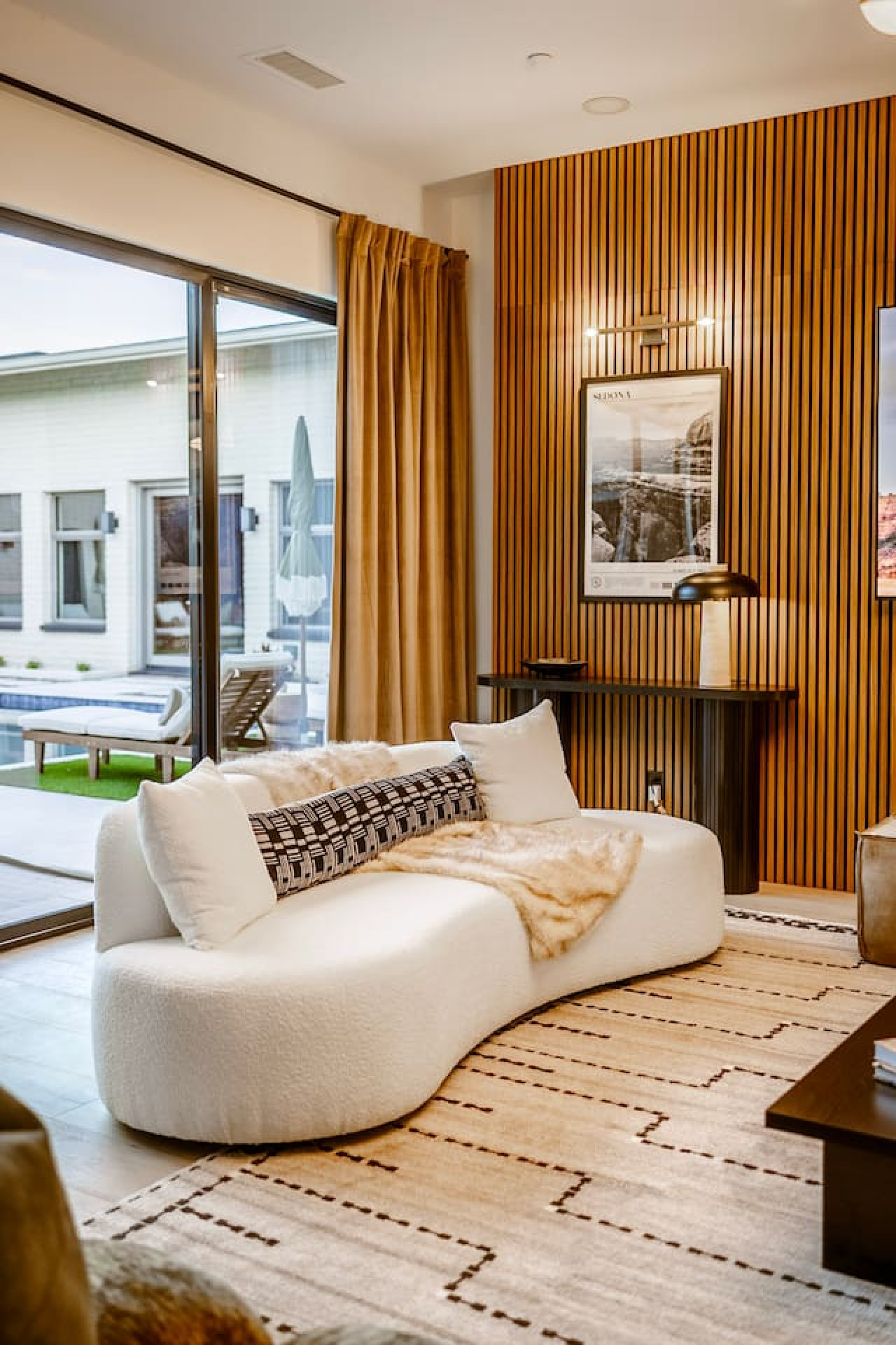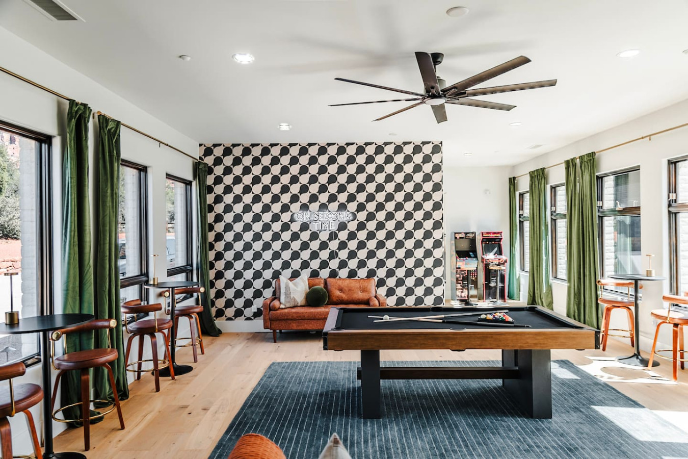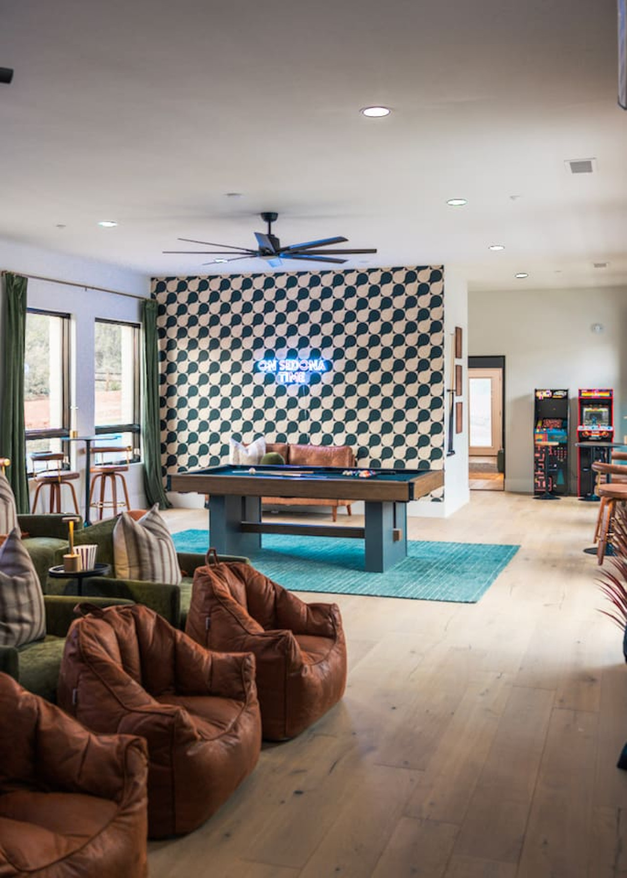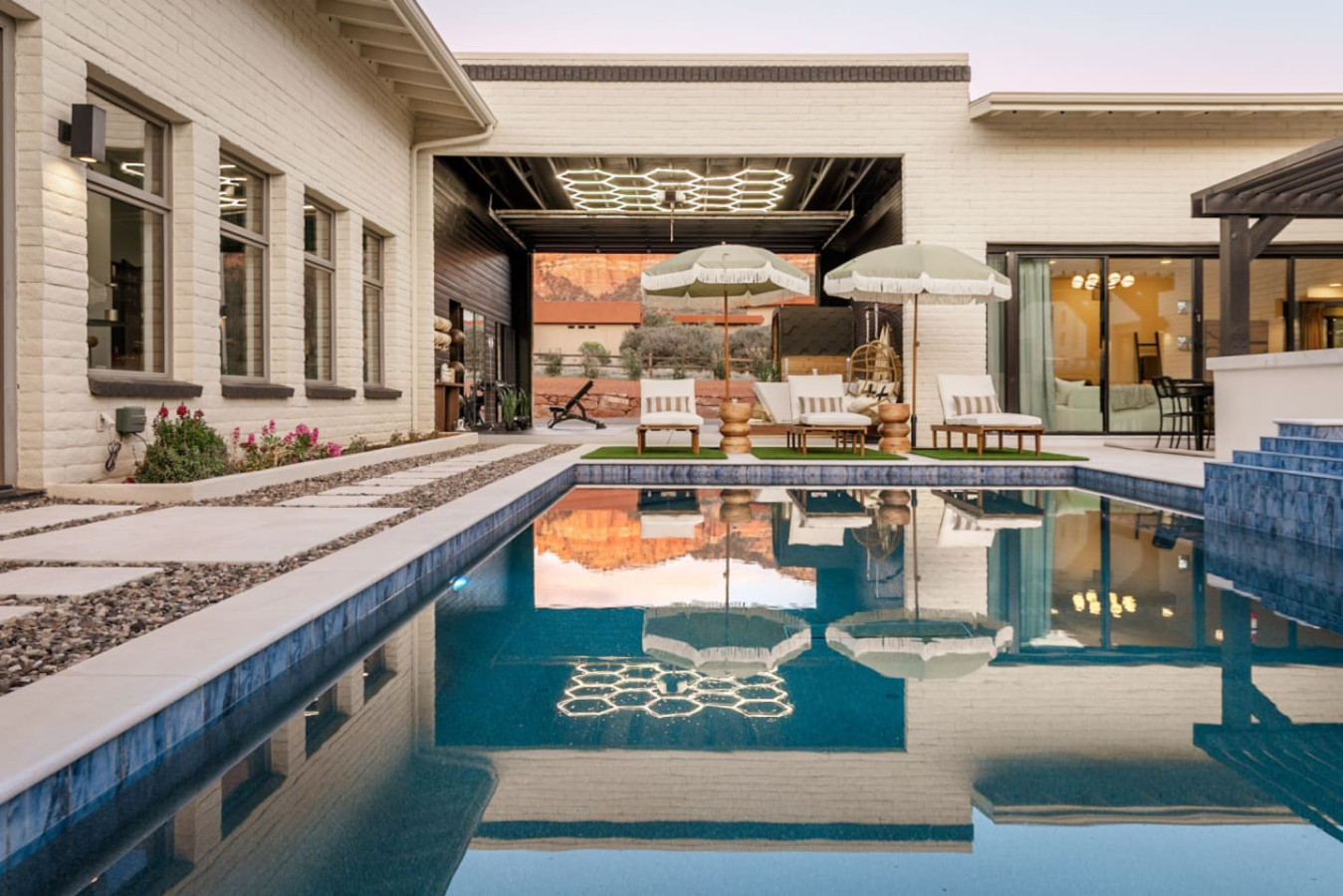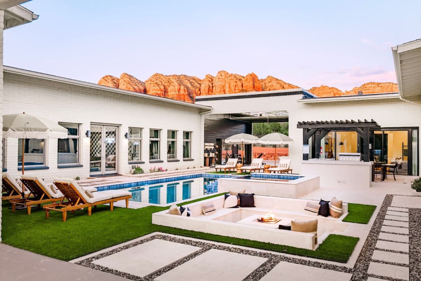 This expansive 5,355 sq. ft. estate offers all six bedrooms and 4.5 bathrooms thoughtfully designed on a single level beneath one roof, creating effortless flow and comfort for your entire group. The home is divided into two distinct wings, connected by the stunning private courtyard and fully equipped wellness studio, offering the perfect balance of seclusion and shared gathering space. Enjoy generous space to spread out and unwind, while still gathering together in the beautifully designed shared living areas and intimate private grounds.