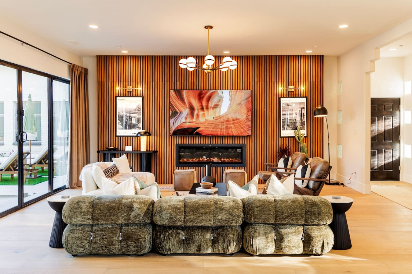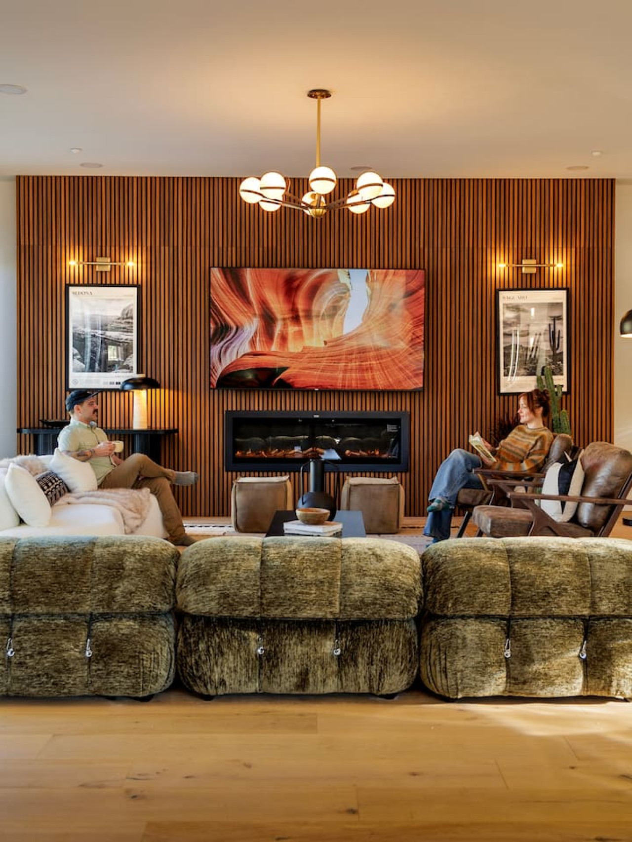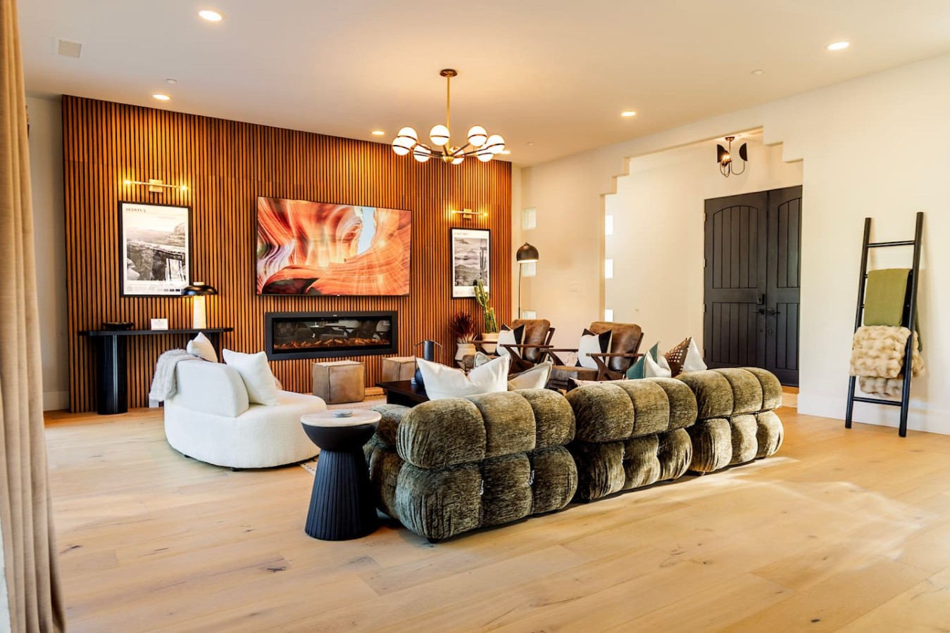 ✔ Stylish living room with smart TV, electric fireplace
