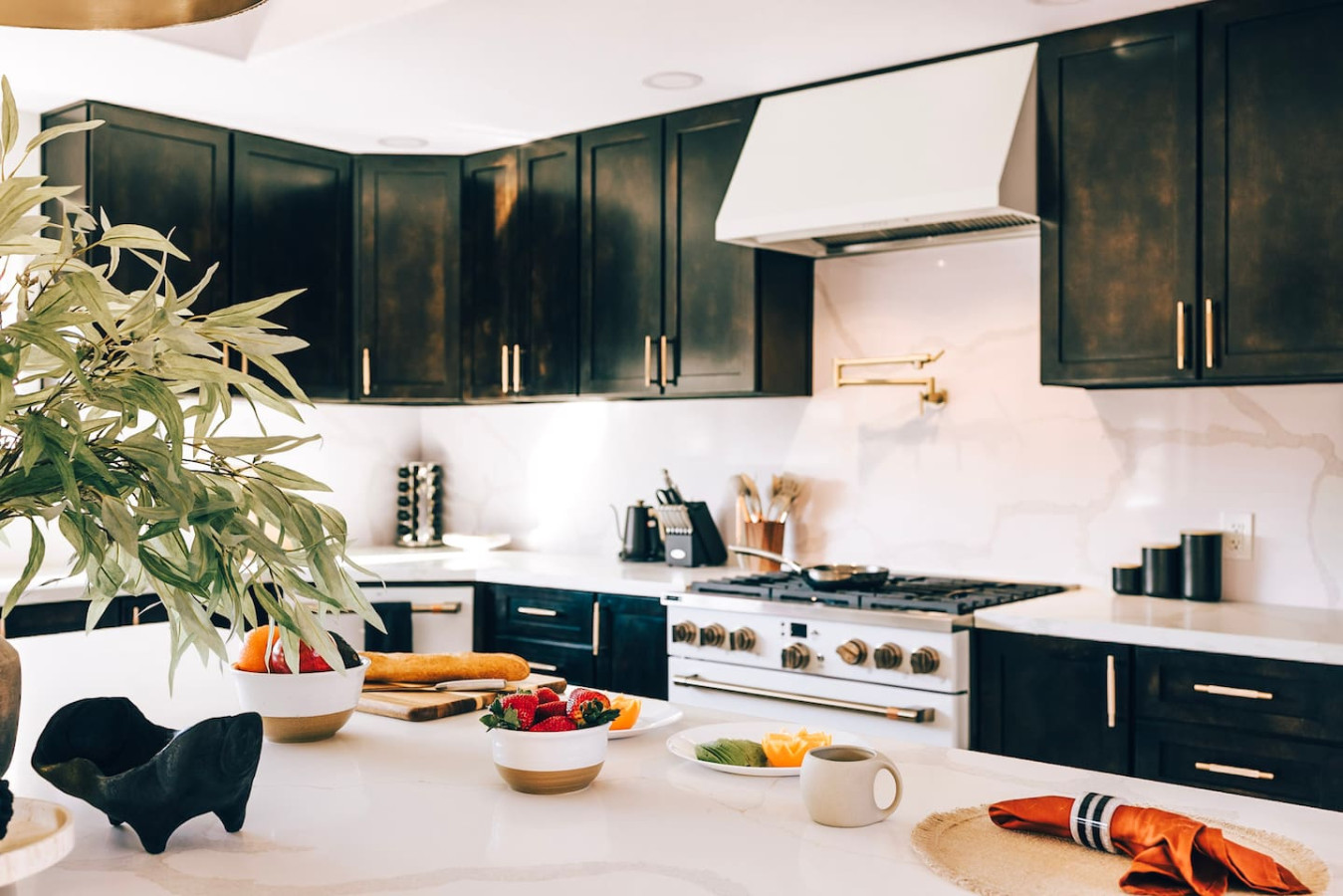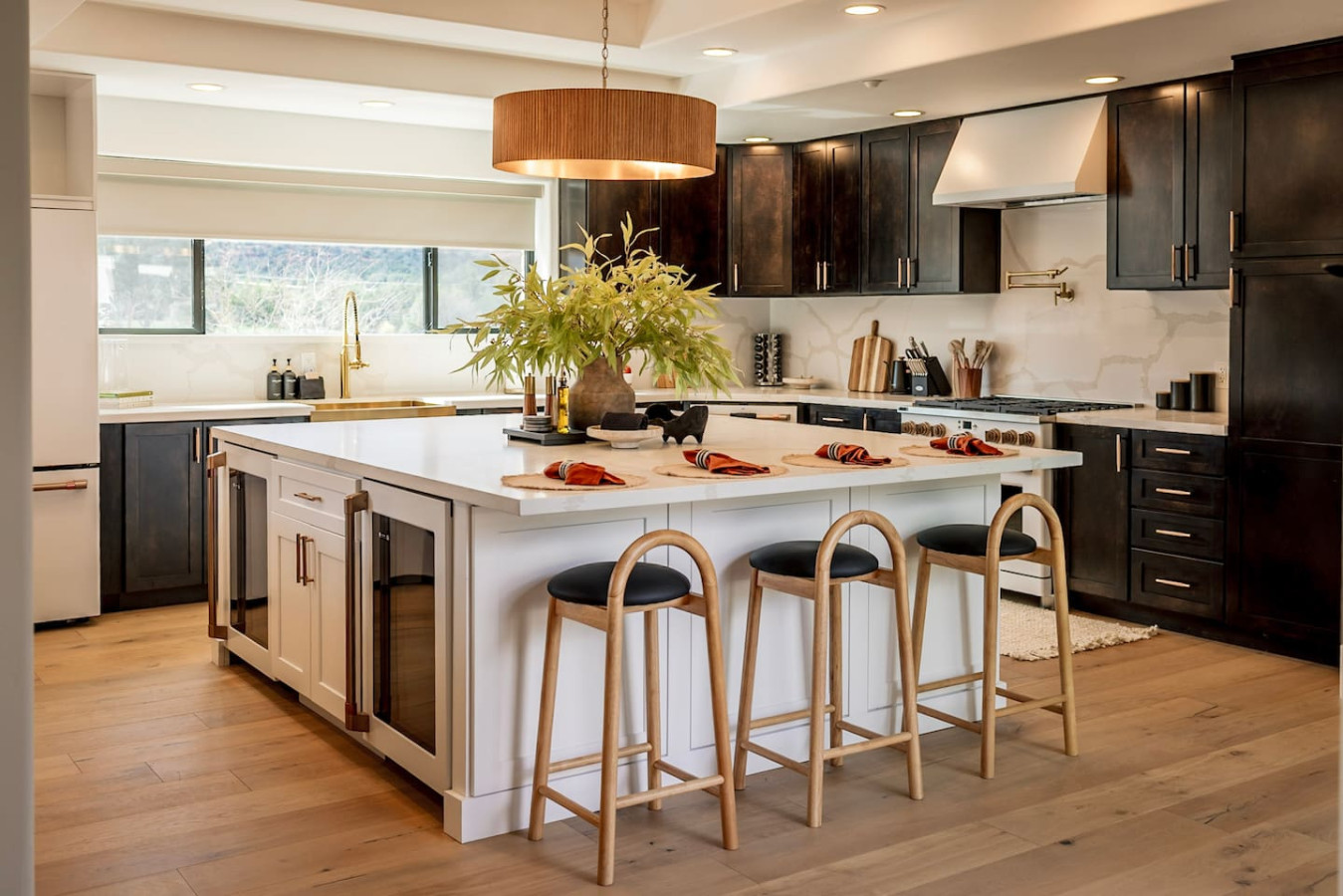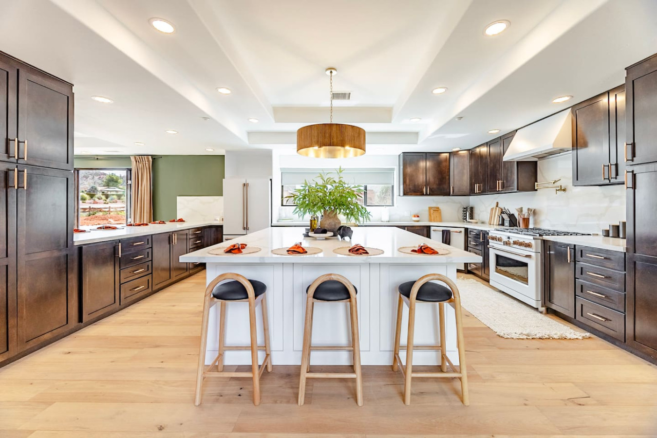 The chef’s kitchen is a showpiece: featuring wraparound quartz countertops, a 6-burner gas Café range, high-end appliances, two wine fridges, and a massive island perfect for cooking together or sipping wine while the sun dips behind the mountains.