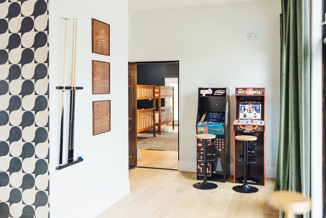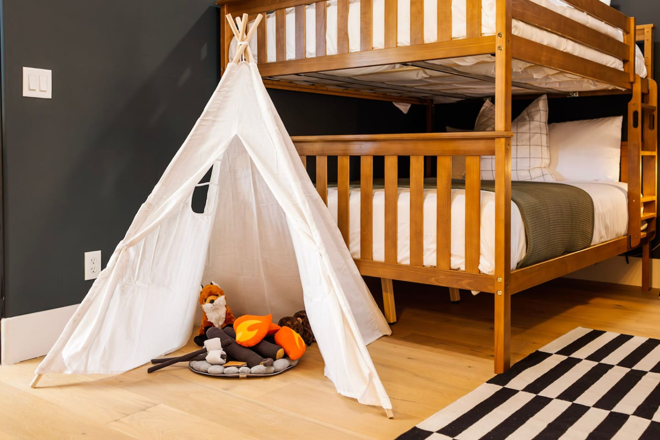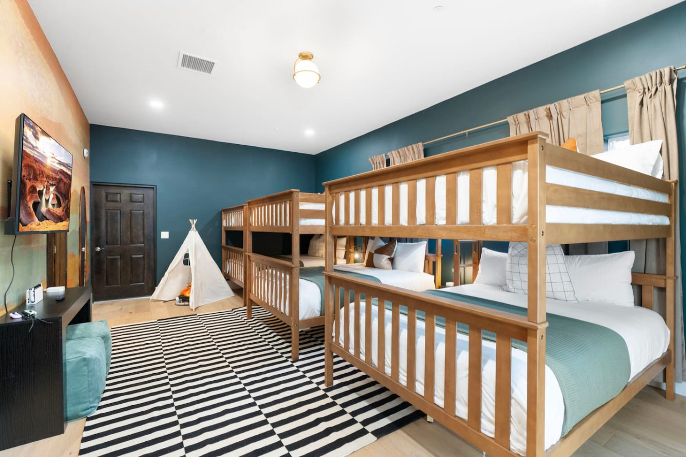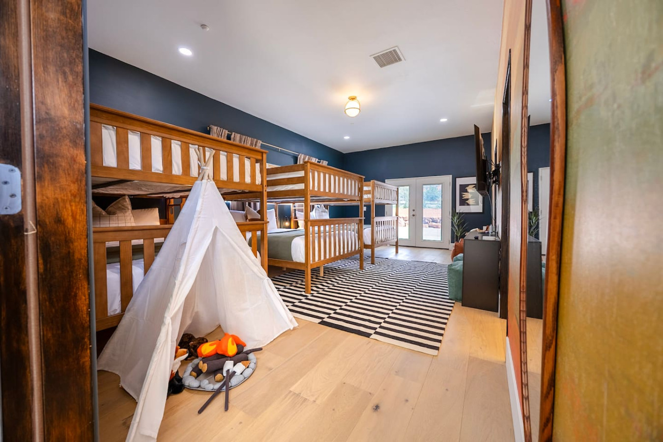 The bunk bedroom is located off the game room and features three queen over queen bunk beds. This room is perfect for large families seeking space for their kids or groups looking for their own individual beds. The room includes a 65" Smart TV with a Nintendo Switch, kids amenities, and an ensuite bath with a luxury walk-in shower.