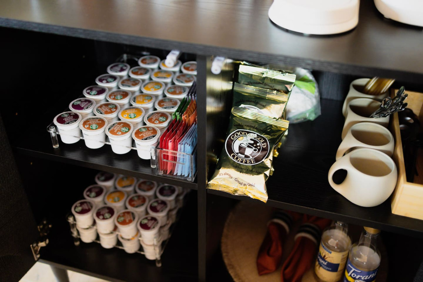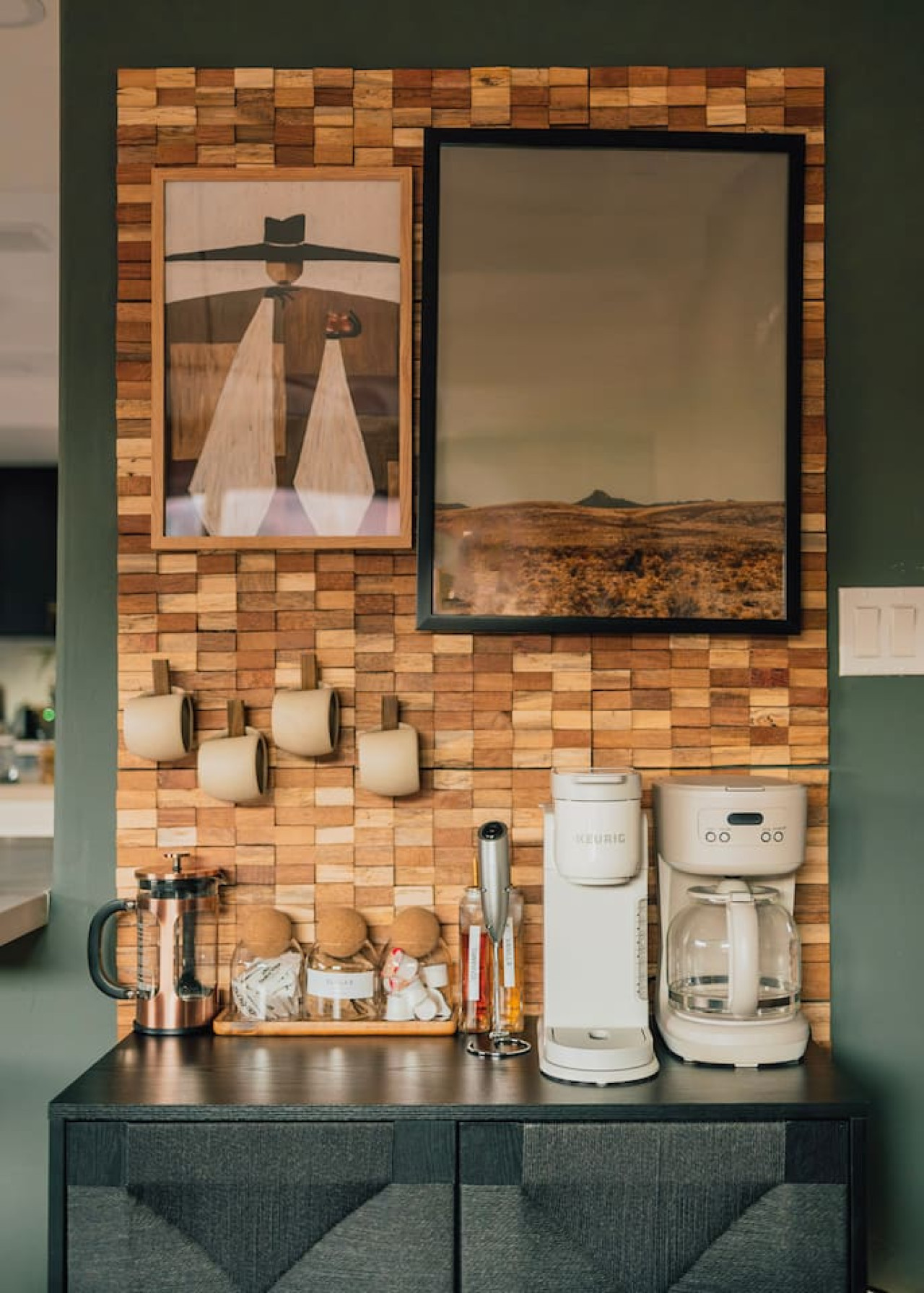 ✔ Coffee station with drip coffee maker, french press, and frother