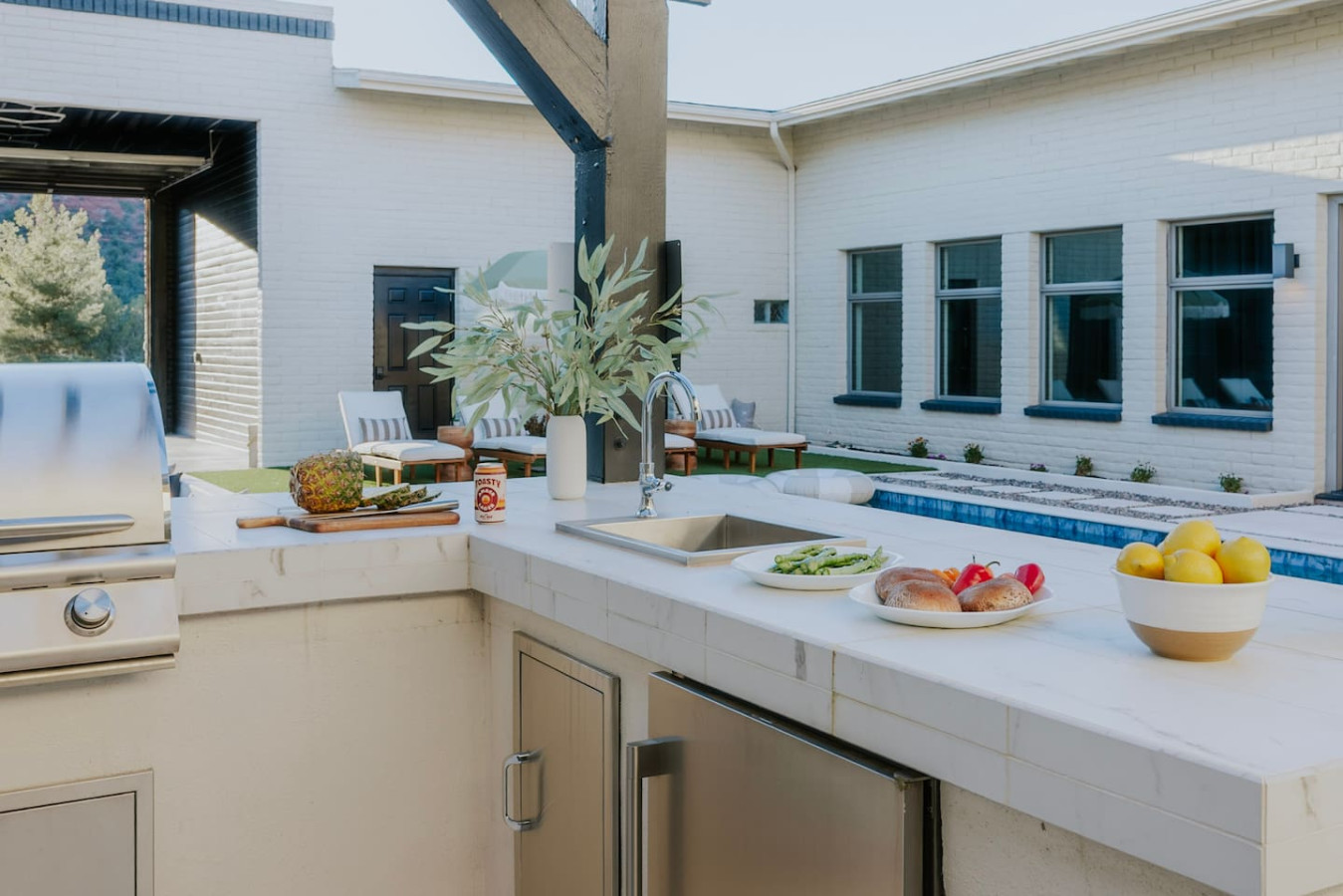 ✔ Outdoor kitchen with Blaze BBQ, sink, mini fridge, and countertop prep space